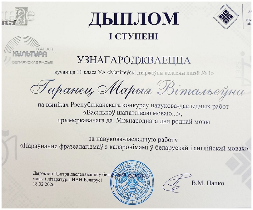 “Васількоў шапатліваю моваю …”, прымеркаванага да Міжнароднага дня роднай мовы. Дыпломам І ступені ўзнагароджана Гаранец Марыя, вучаніца 11 “Е” класа ўстановы адукацыі “Магілёўскі дзяржазны абласны ліцэй №1”, за навукова-даследчую работу “Параўнанне фразеалагізмаў з каларонімамі ў беларускай і англійскай мовах”.